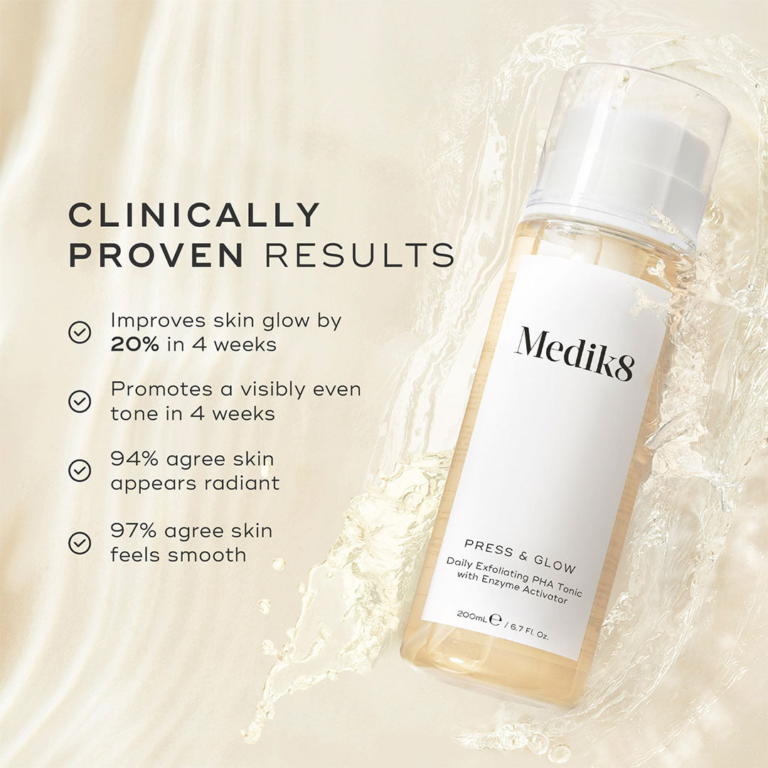 At Medik8, we have two clinically proven stars of daily acid toning: Press & Glow and Press & Clear. Born out of the need for powerful, exfoliating acid toners that can be used every day, twice a day, both formulations are non-drying, non-sticky and always gentle on the skin. Press & Glow and Press & Clear are suitable for all skin types, including sensitive skins. The perfect upgrade to your daily Medik8 regime.