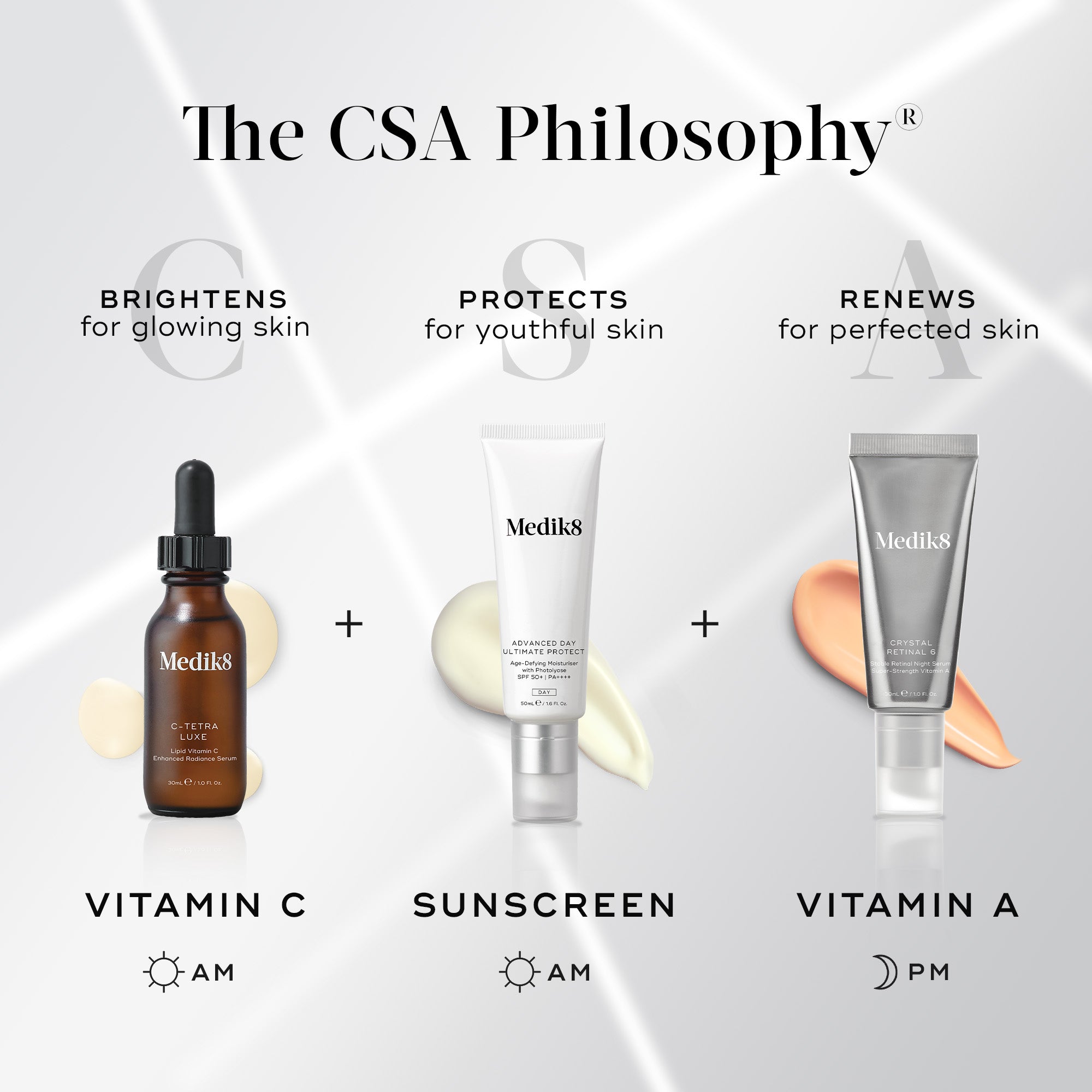 Enhance the visible benefits of daily UV protection by adding vitamin C and vitamin A to your regular skincare routine. This powerhouse trio is the holy grail to achieving more youthful-looking skin and makes up Medik8’s pioneering CSA Philosophy: vitamin C plus sunscreen by day, vitamin A by night. Follow this simple, clinically proven approach and discover Beautiful Skin for Life.
